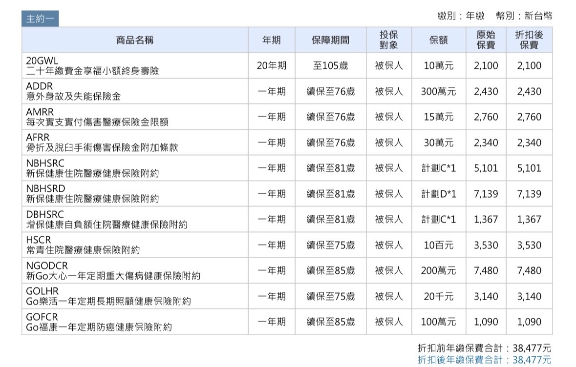 安聯的產品我未整理加上保險員沒有給我一份建議書,有跟他要求但是只給我細項也沒有產品名稱🙂加上保險業務感覺都沒處理過需要補有體況病歷送審,幾次交談下來感覺上有點小失望