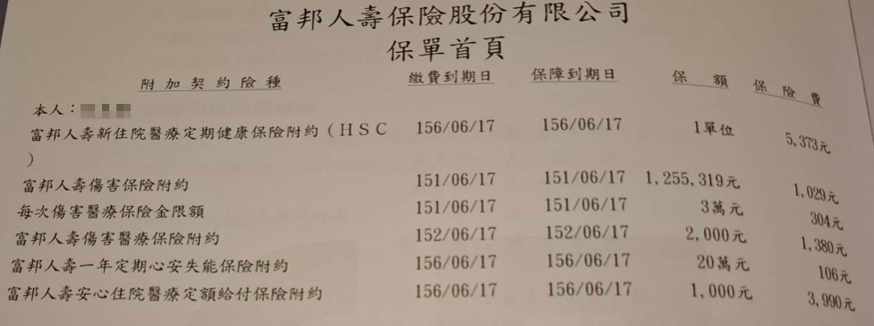 富邦正本理賠 住院雜費:102306 住院手術/門診手術:18萬