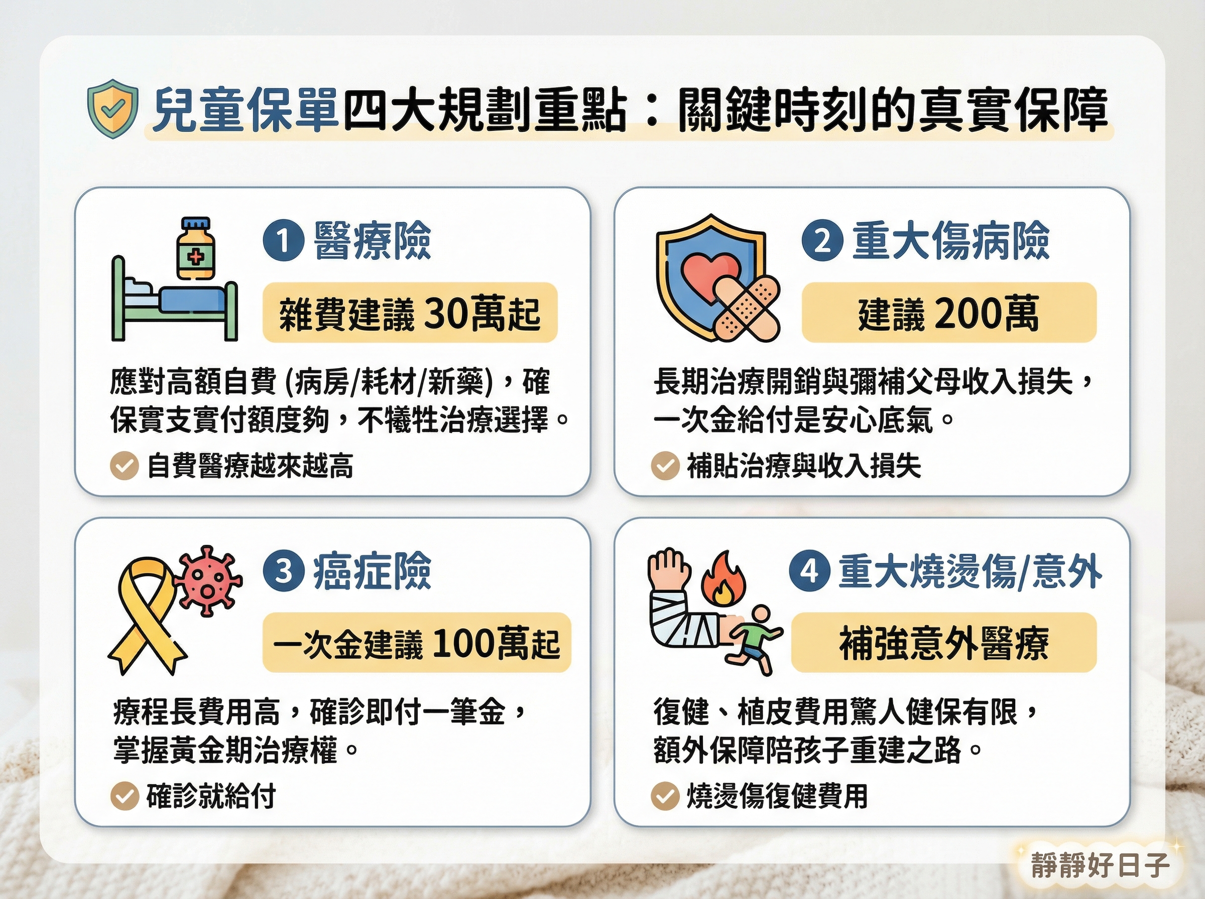 🔸完整建議規劃方向:醫療實支實付(醫療雜費30萬)、意外險(壽險+產險)、重大傷病險、癌症險(一次金)、長照險(一次金+扶助金)、壽險