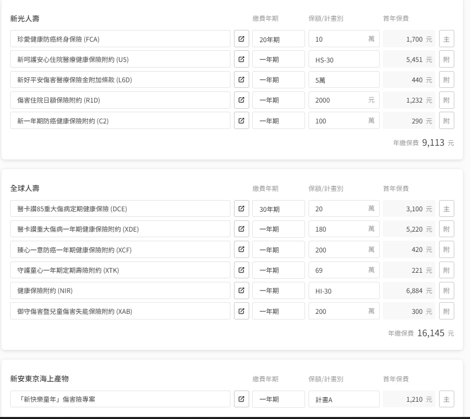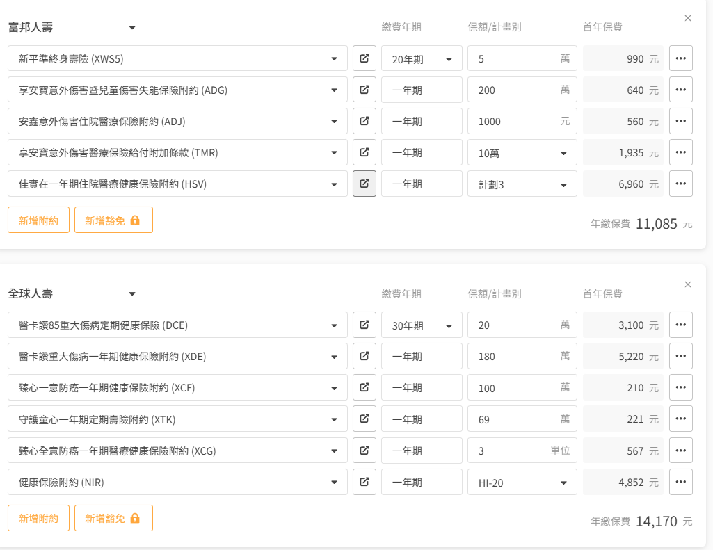 意外保障也多過於富邦+全球的規劃。