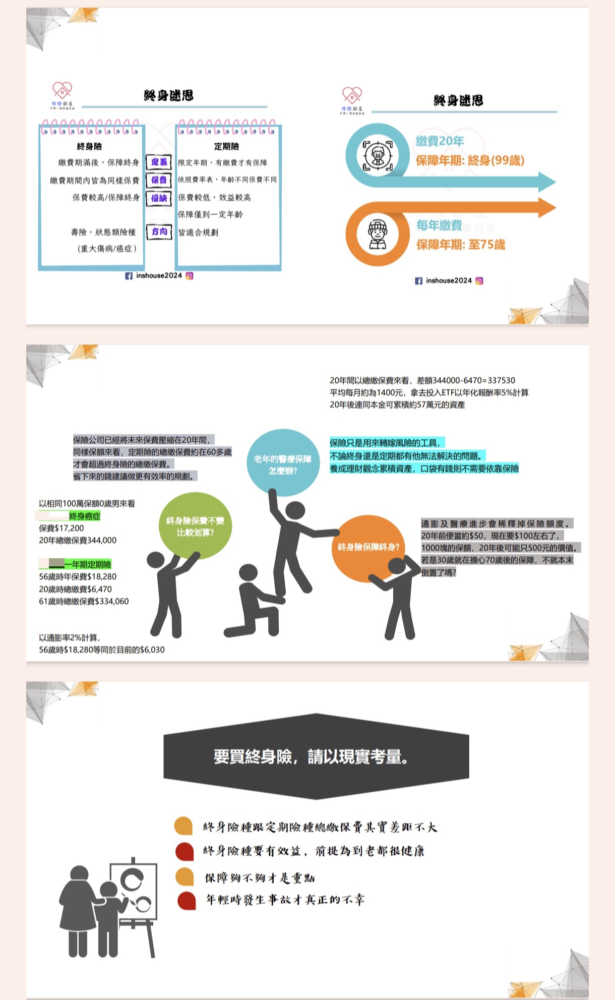 🔸完整建議規劃方向:醫療實支實付(醫療雜費30萬)、意外險(壽險+產險)、重大傷病險、癌症險(一次金)、長照險(一次金+扶助金)、壽險(家庭責任)