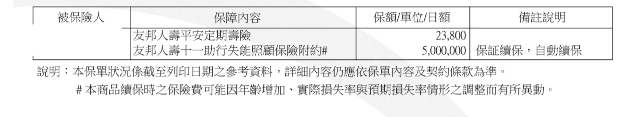 目前31歲,製造業工程師,薪資工作皆穩定,職等應該算是2,身體健康狀況目前都正常,沒有慢性病及重大疾病~台灣人壽的主約和友邦人壽的主約皆以減額繳清。