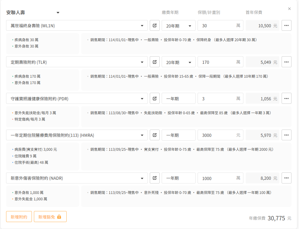 🔸完整建議規劃方向:醫療實支實付(醫療雜費30萬)、意外險(壽險+產險)、重大傷病險、癌症險(一次金)、長照險(一次金+扶助金)、壽險