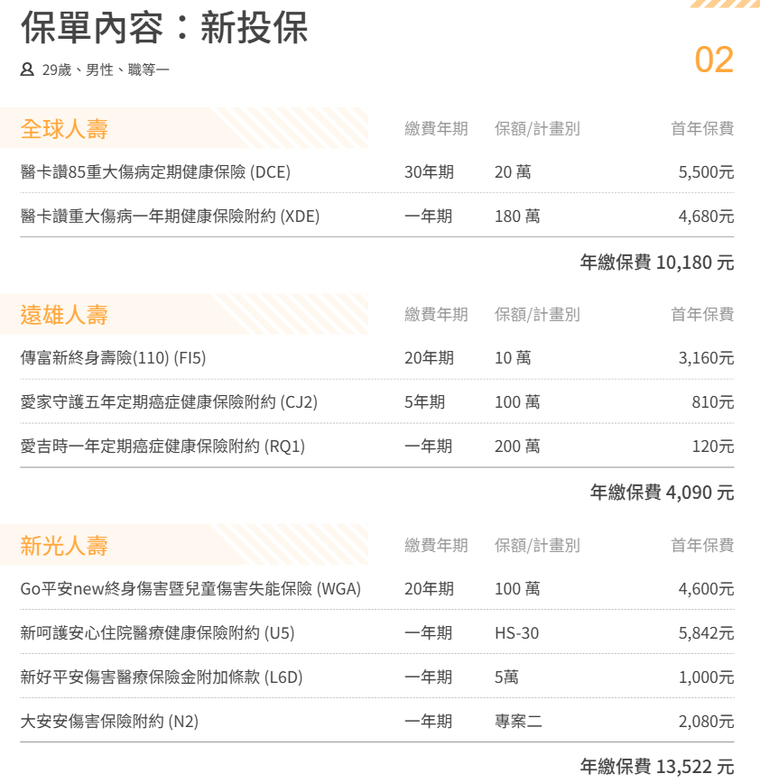 🔸完整建議規劃方向:醫療實支實付(醫療雜費30萬)、意外險(壽險+產險)、重大傷病險、癌症險(一次金)、長照險(一次金+扶助金)、壽險