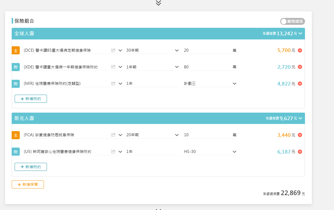 目前比較著重在意外還有疾病跟醫療上面,壽險跟癌症還有長照想要之後能力更充沛的時候再額外增加