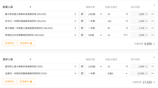 癌症險則會先評估遠雄 , 退而求其次會因應實支實付而用新光的選項
