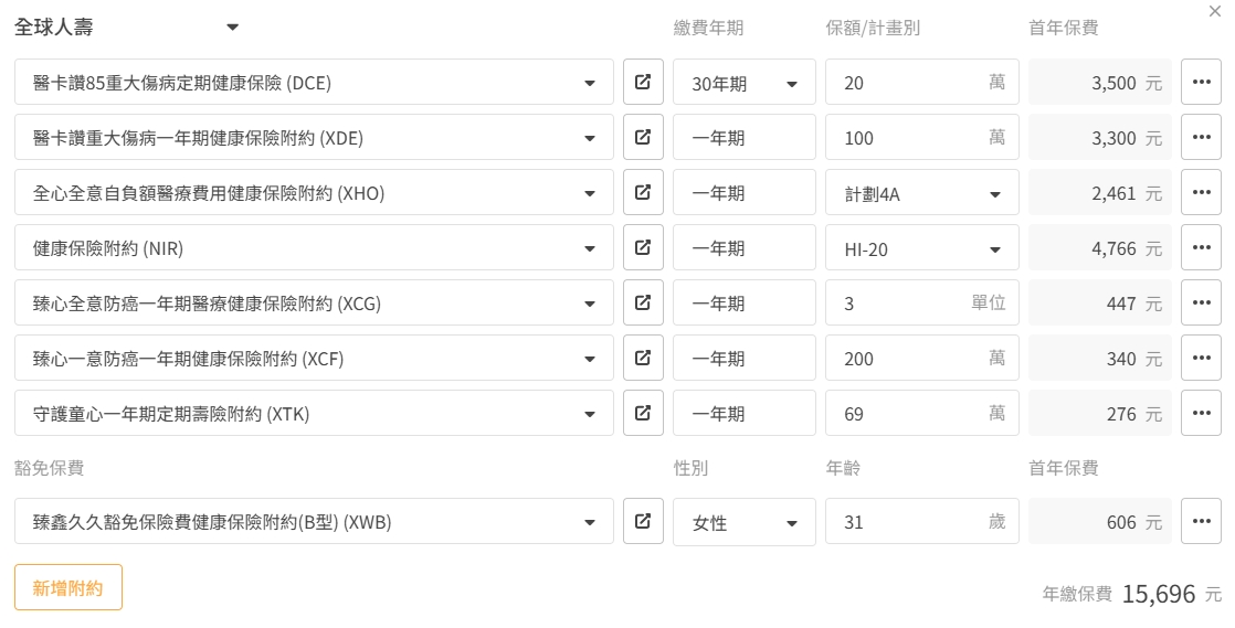 全球可在附加意外失能XAB,保費很低,保障最高200萬