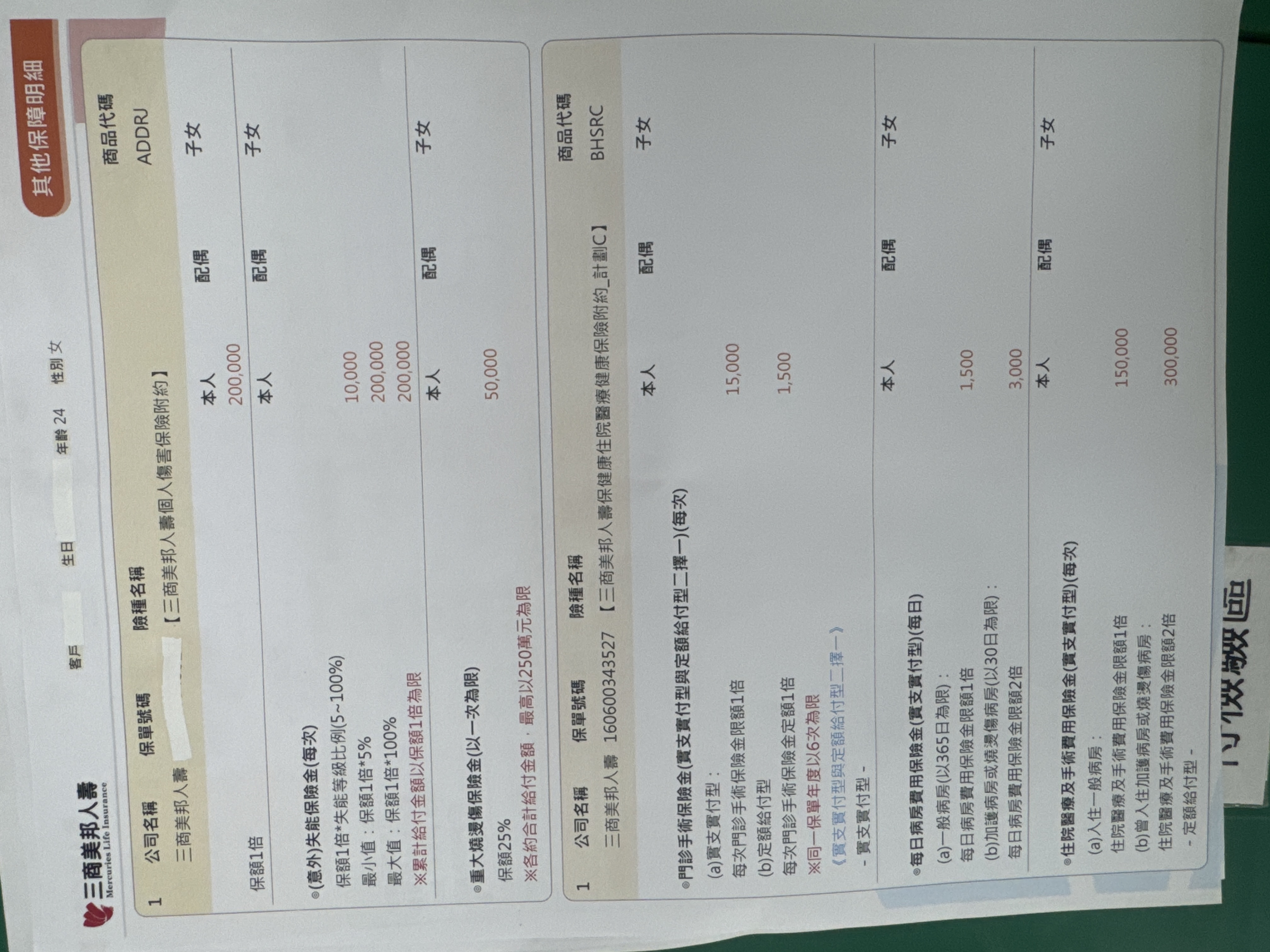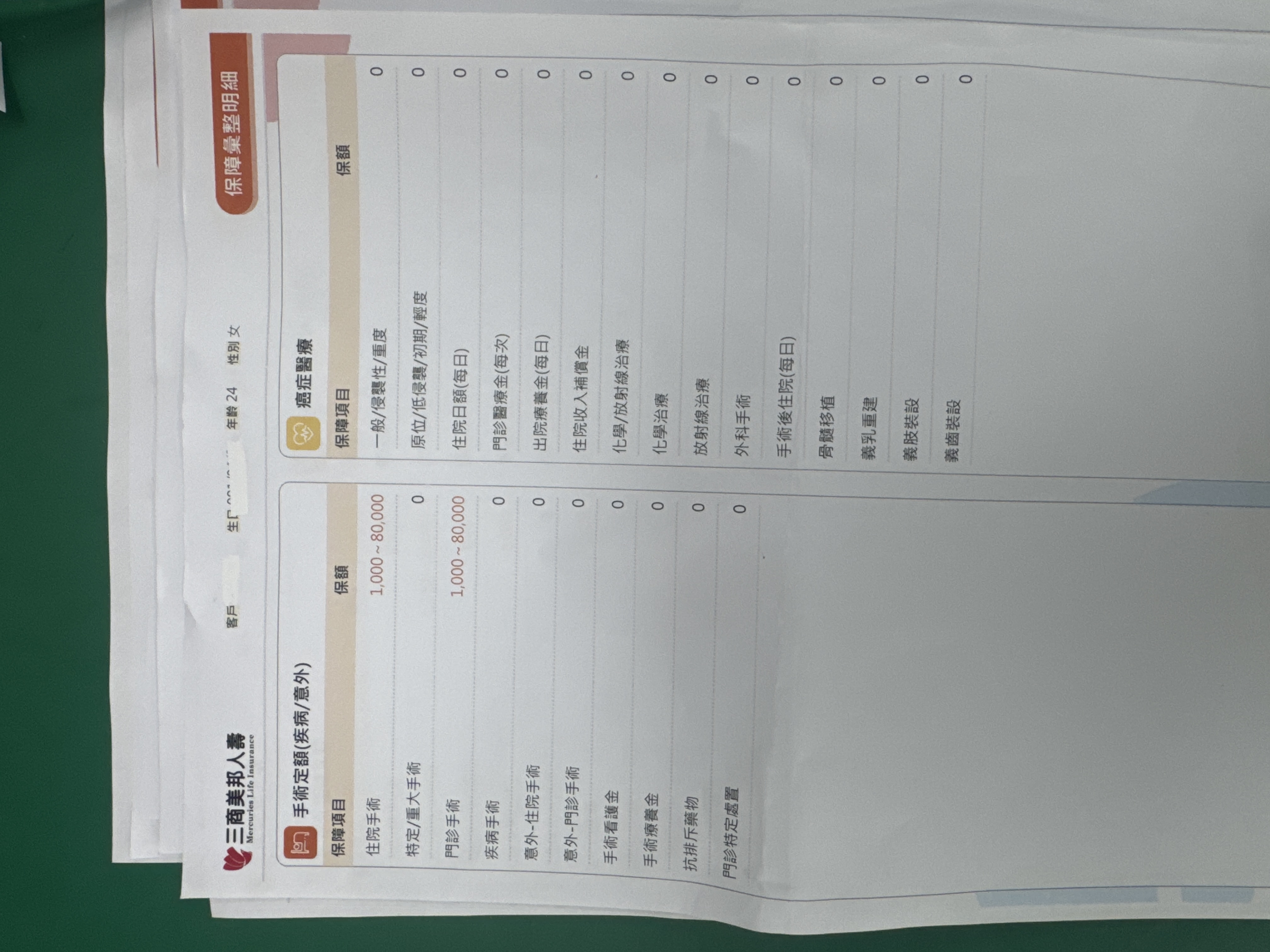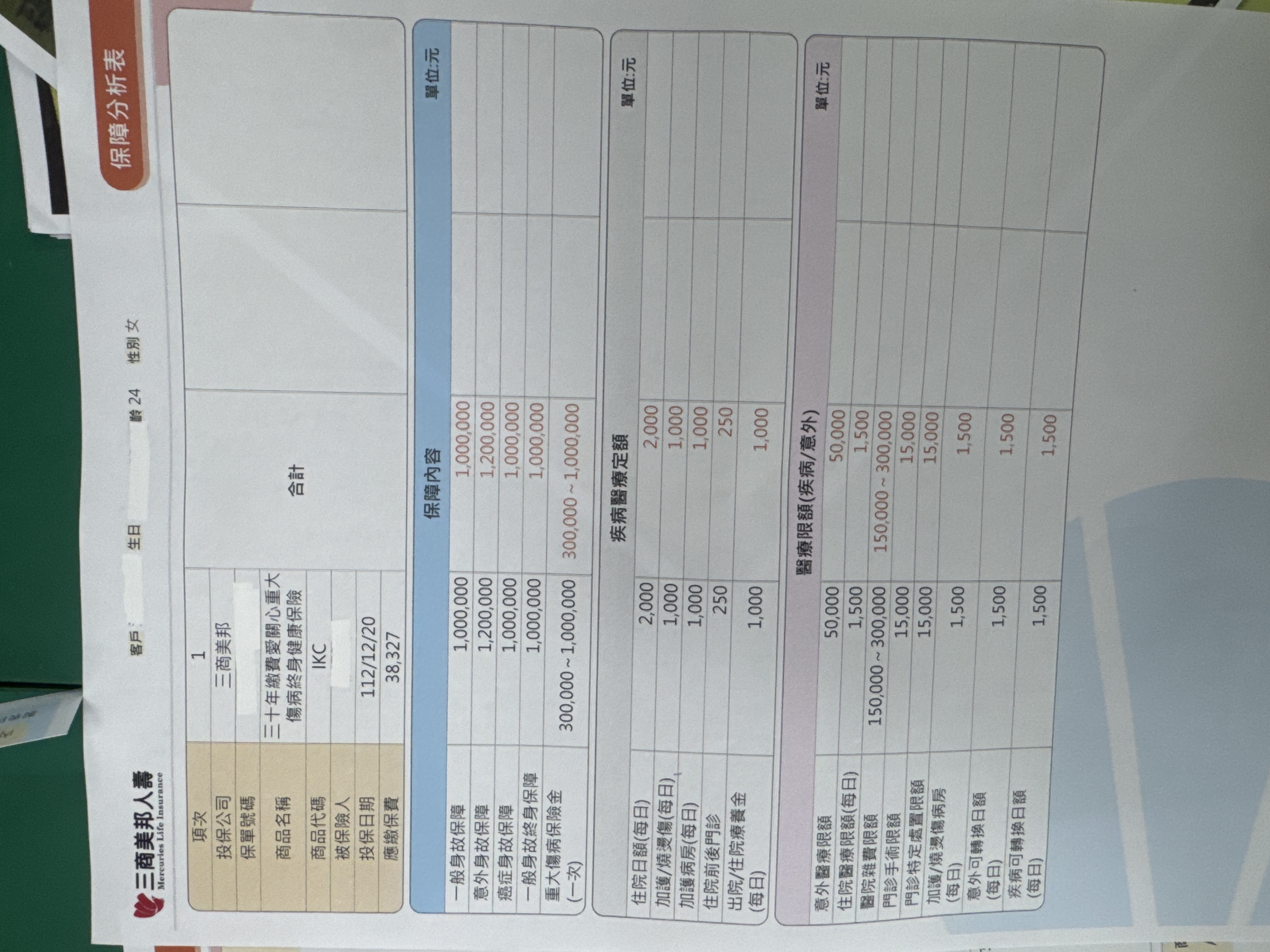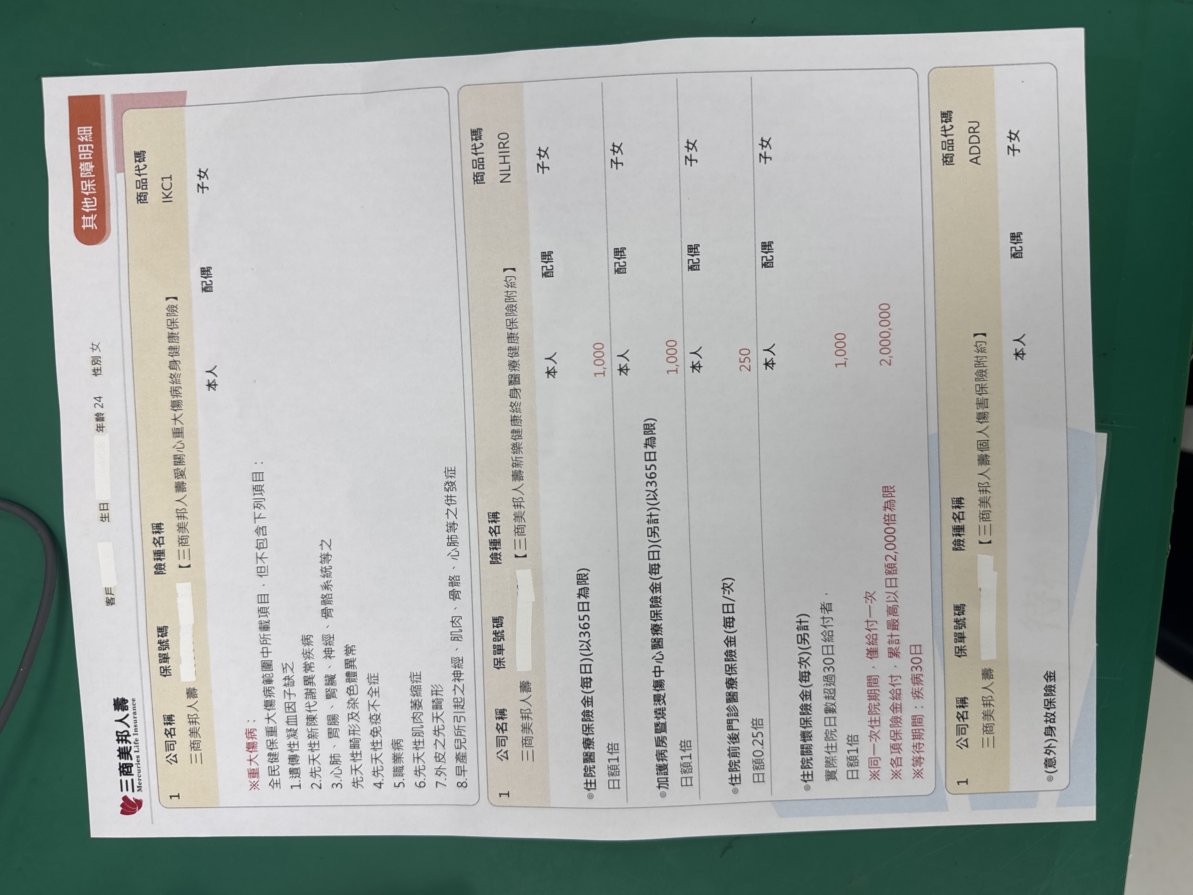三商:將主約降額到10萬,然後附約的實支降到B計畫(方便自負額銜接),增加癌症一次金100萬定期險,刪除終身醫療