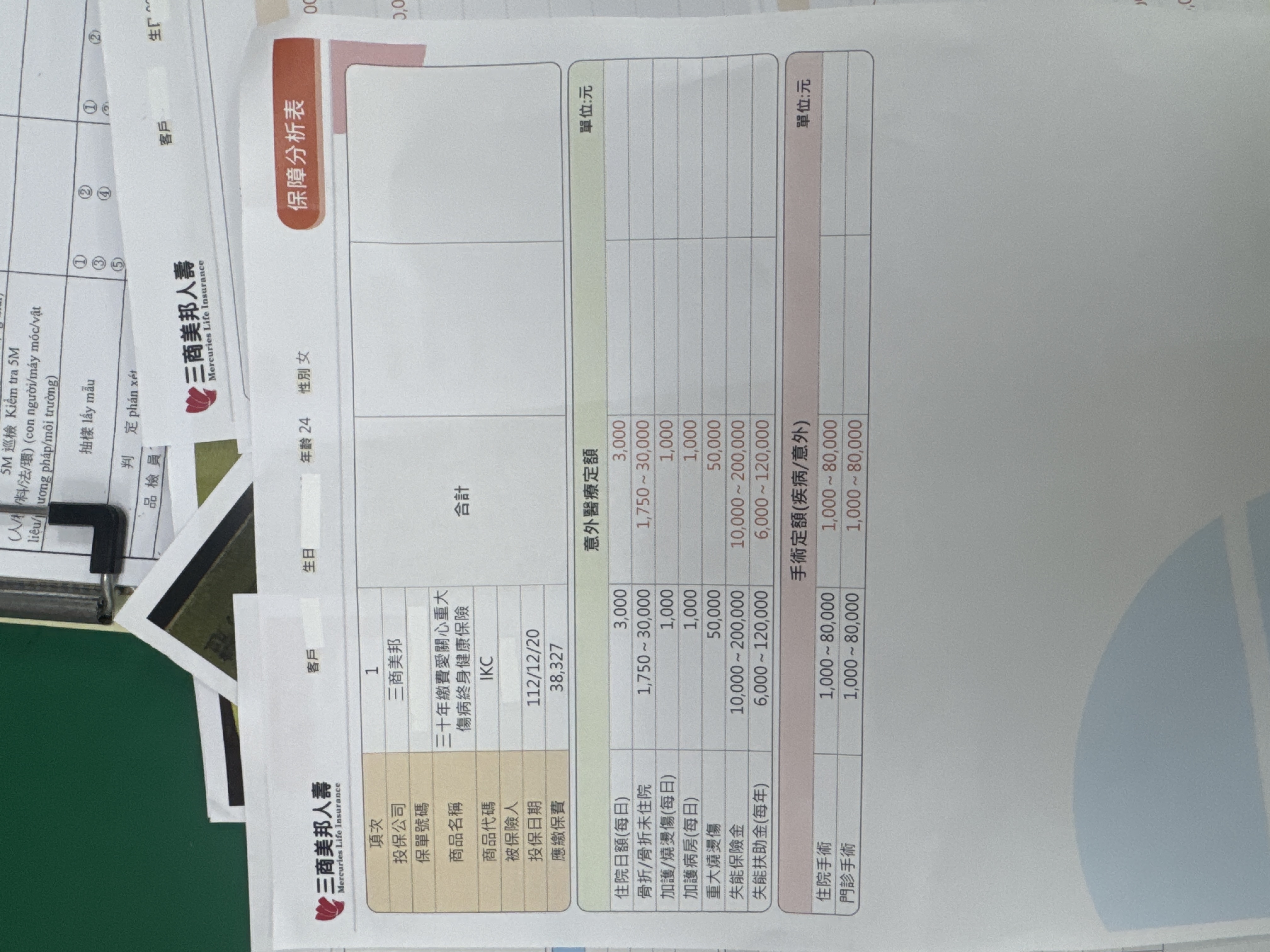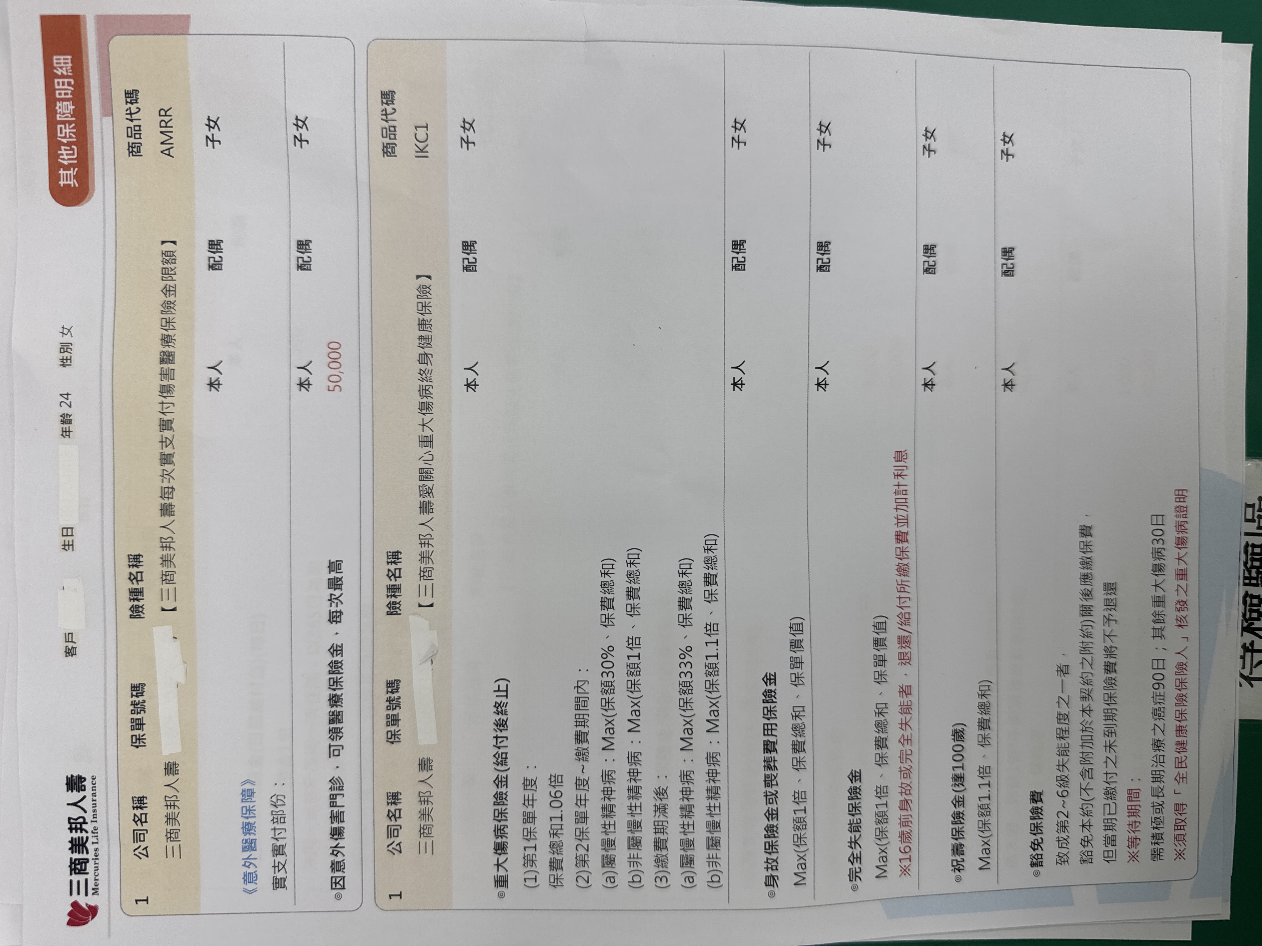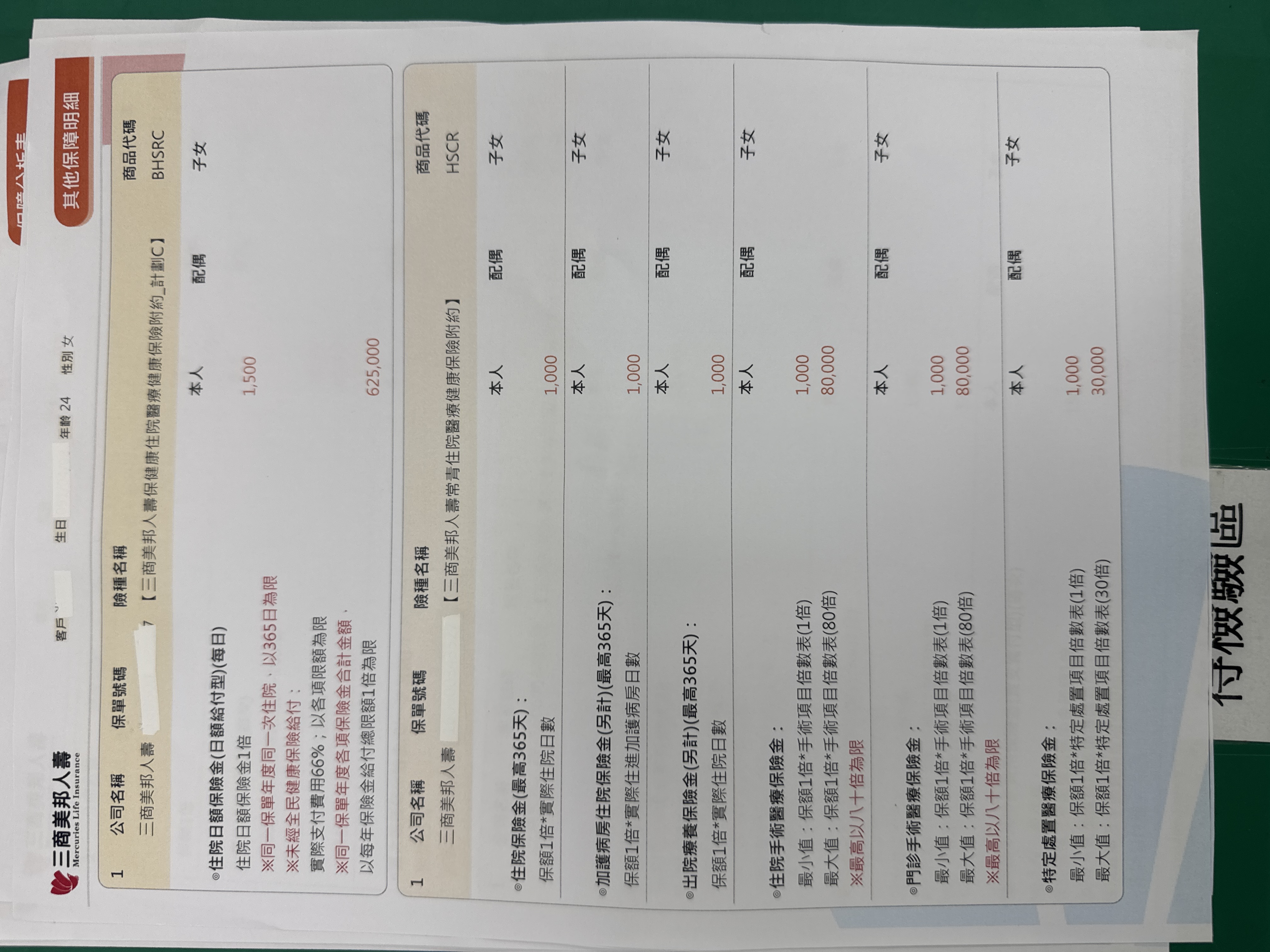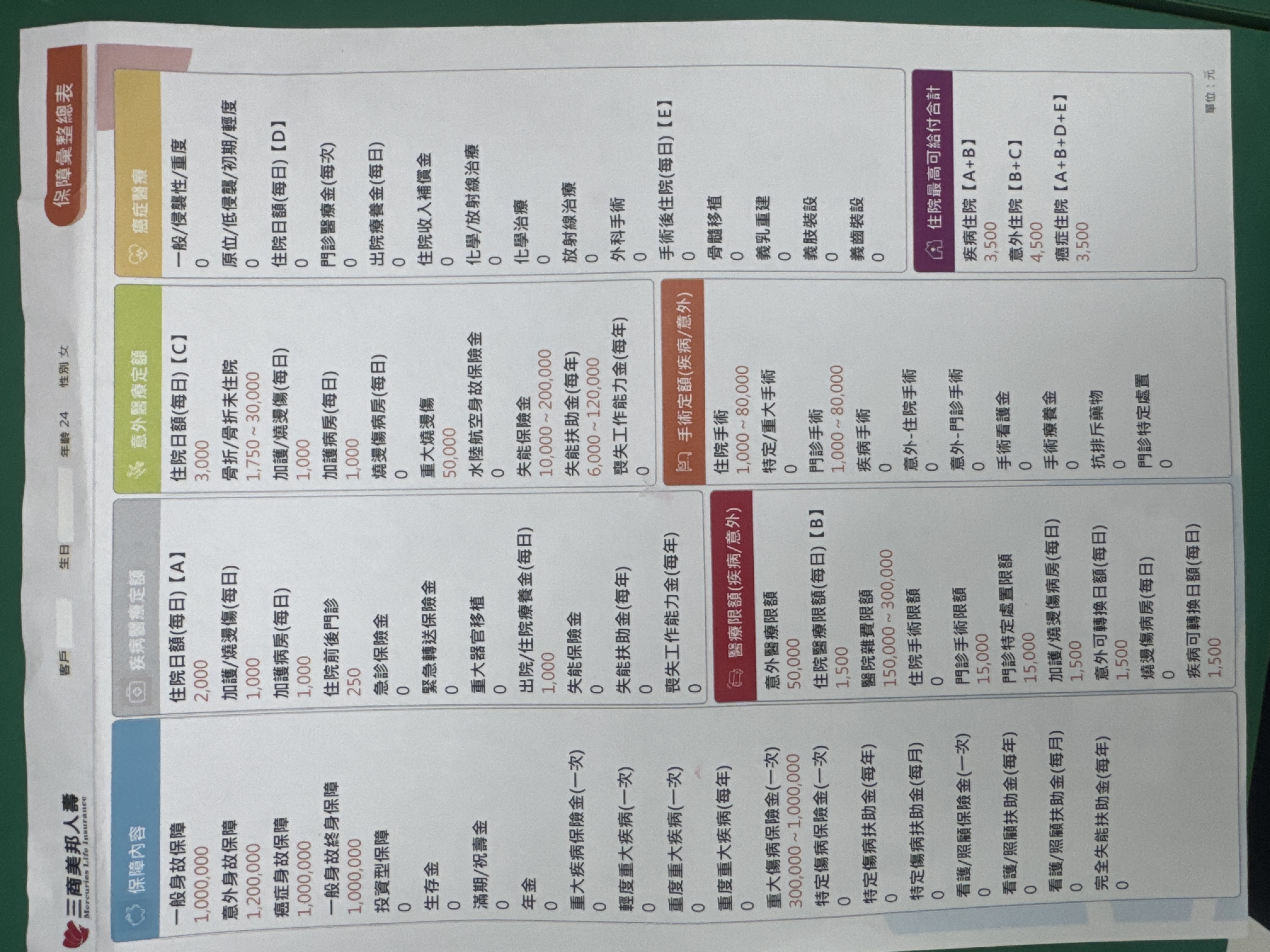 三商:將主約降額到10萬,然後附約的實支降到B計畫(方便自負額銜接),增加癌症一次金100萬定期險,刪除終身醫療