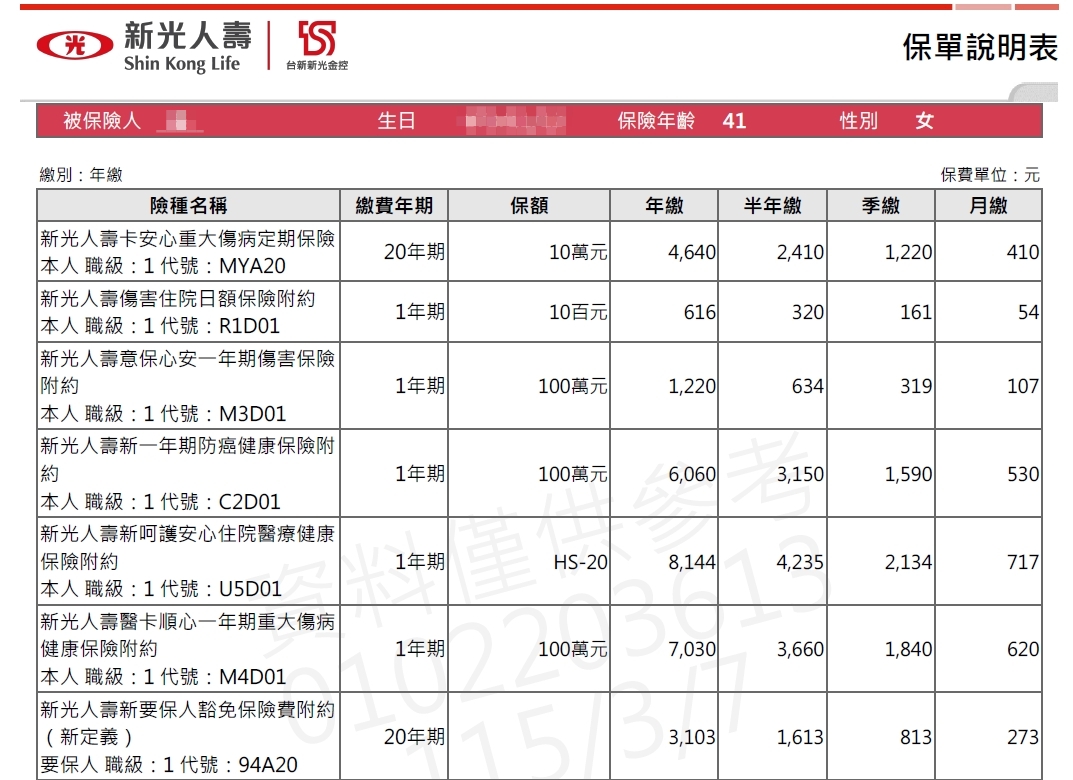 綜上所述,目前醫療實支實付、意外三寶跟癌症一次金規劃新光沒問題,內容稍微調整如上,豁免再視預算來決定是否要投保;另外,重大傷病建議可以優先參考全球的規劃,條款完善且後期保費漲幅較平穩喔