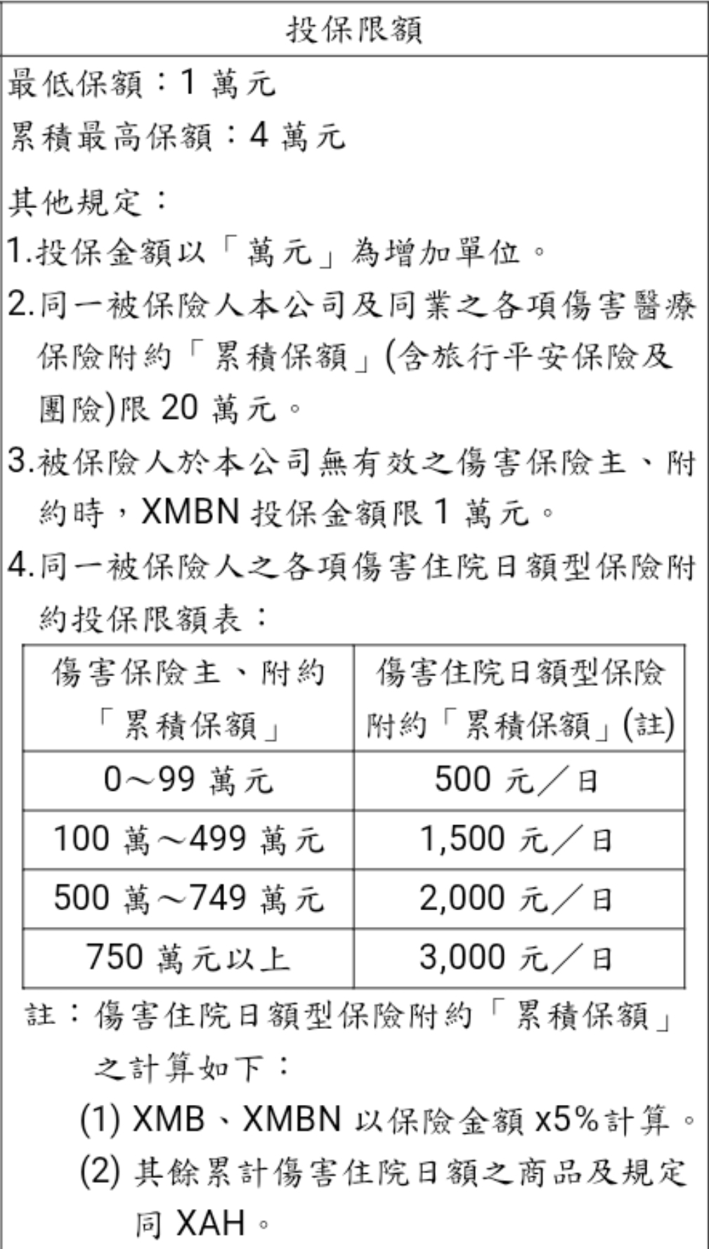🅰️單純投保意外實支XMBN,最高投保額度1萬;若有投保意外身故XAN保額100-499萬,意外實支XMBN最高保額3萬