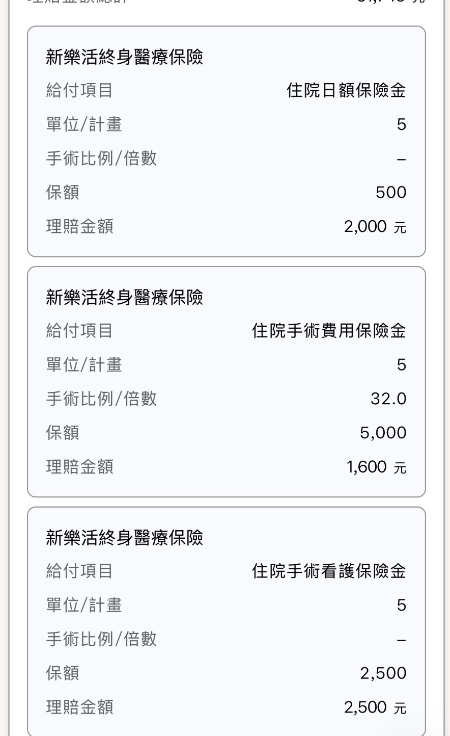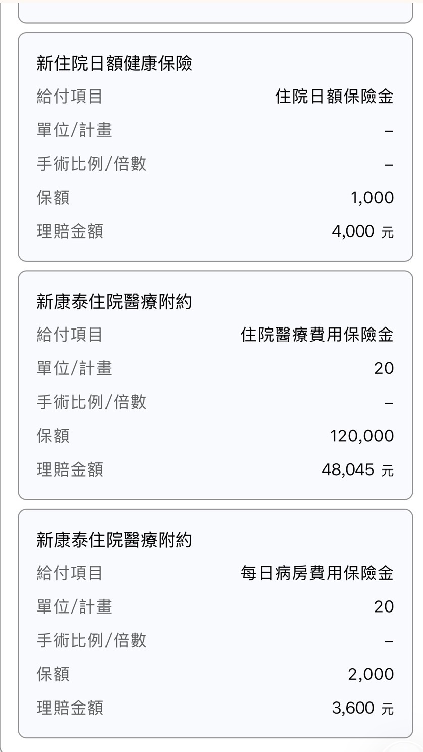 可以幫我看看中國人壽這樣理賠金額是否正確?總感覺怪怪的?新康泰是否手術費是健保給付就沒有賠%數了?