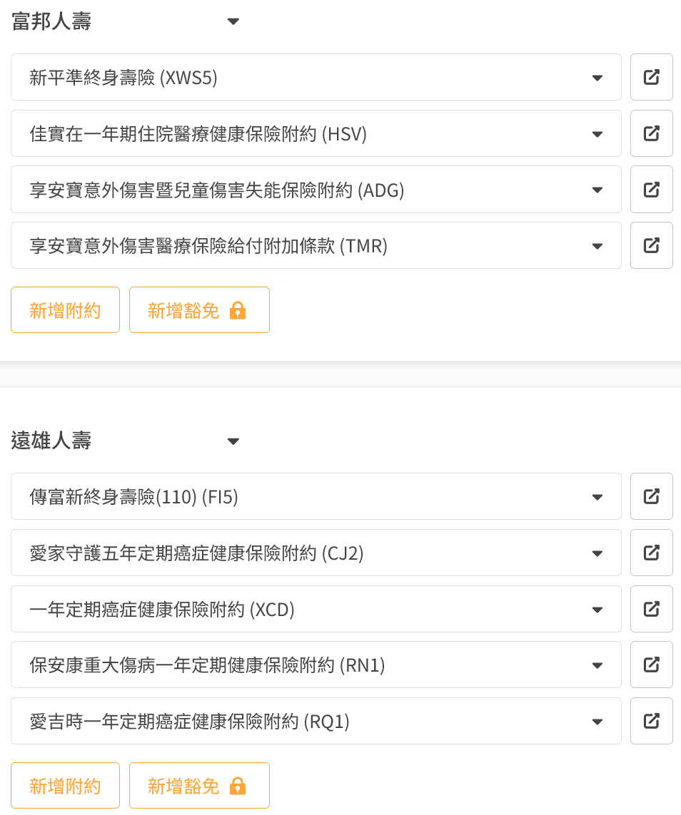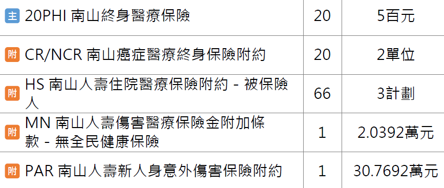🔺舊保單有:終身醫療、終身防癌(療程型)、醫療實支實付、意外身故、意外實支實付