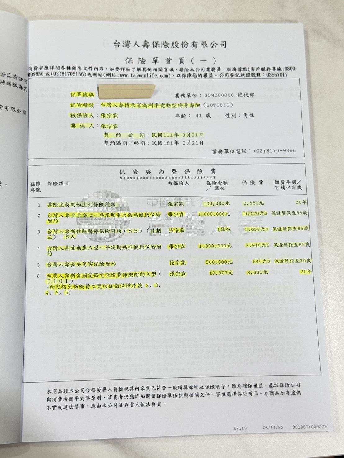 🔺舊保單有:終身壽險、醫療實支實付、重大傷病、癌症一次金、意外身故