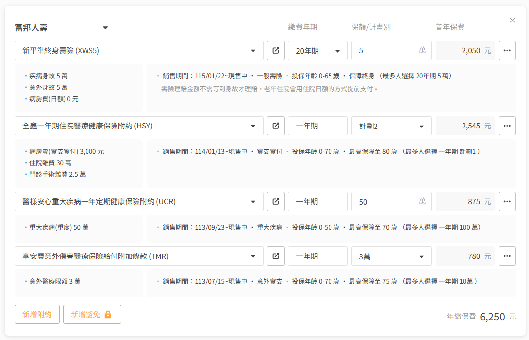 - 富邦:住院費用項目個別計算,但手術受 227/334 限制,可搭配意外險。
