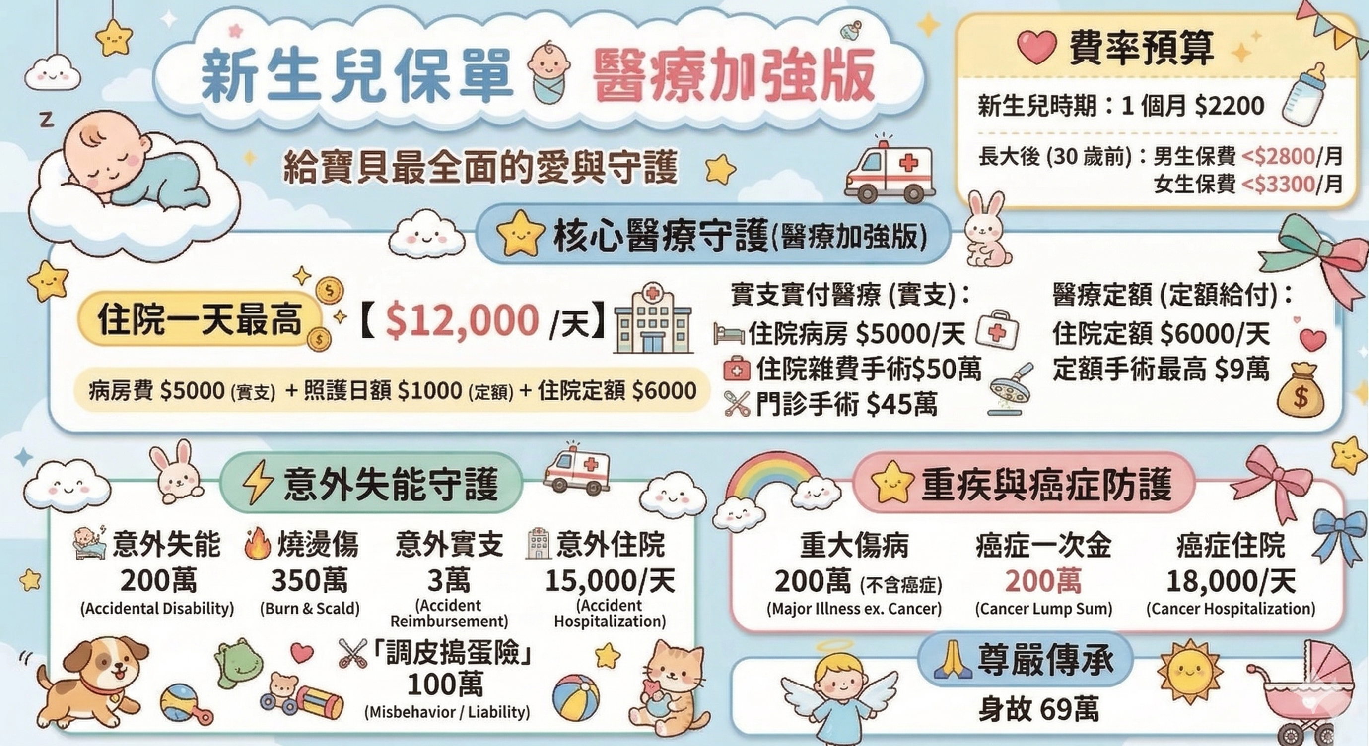 綜上所述,目前大寶跟新生兒的規劃內容相同,首次投保醫療實支實付、意外三寶、重大傷病跟癌症險建議可以優先參考新光/全球+遠雄的規劃,條款完善且後期保費漲幅較平穩,讓保障更全面喔
