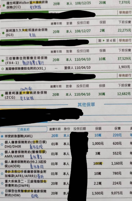 ⭕ 六大保障 : 醫療、癌症、重大傷病、失能(照護)、意外、壽險。