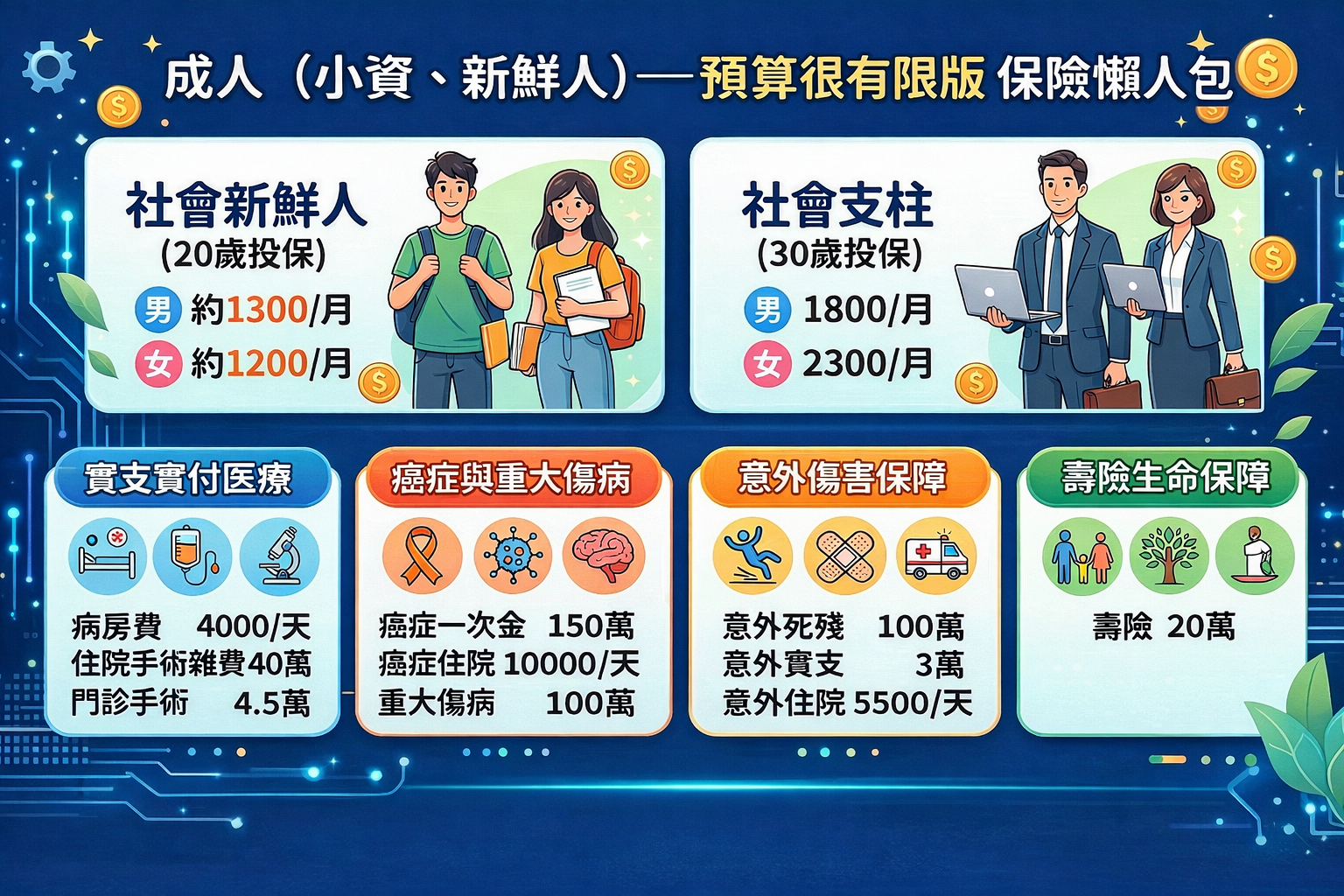 ⭕ 六大保障 : 醫療、癌症、重大傷病、失能(照護)、意外、壽險。