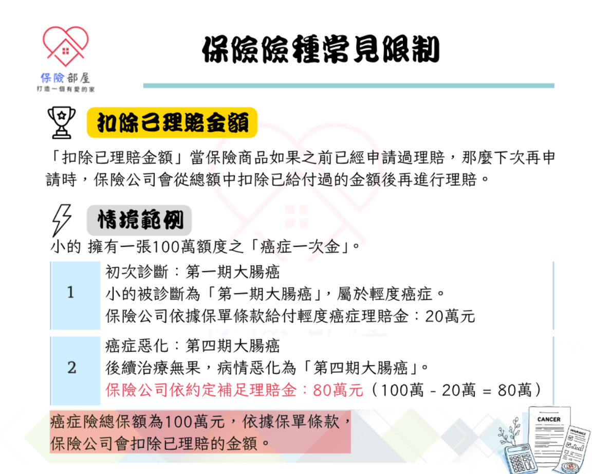 2. 球球癌症首年理賠50%且會扣除已理賠金額。