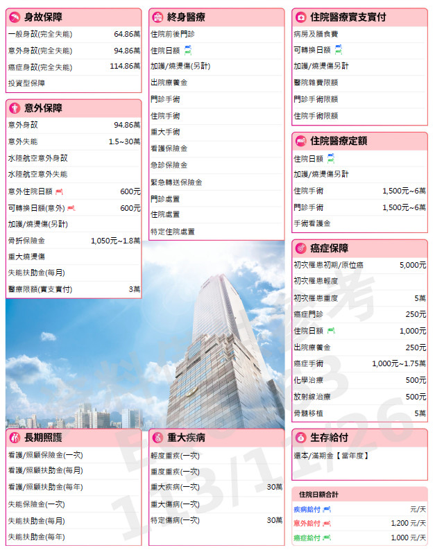 ⭕ 六大保障 : 醫療、癌症、重大傷病、失能(照護)、意外、壽險。