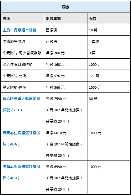 ⭕ 六大保障 : 醫療、癌症、重大傷病、失能(照護)、意外、壽險。